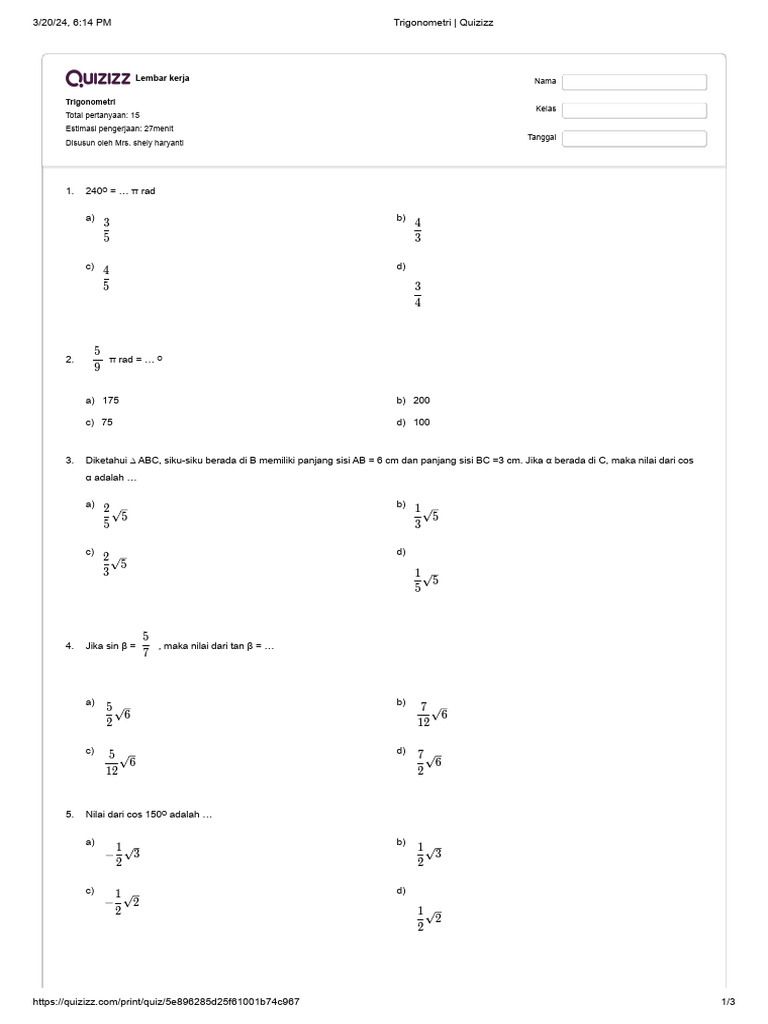 Trigonometri, cabang matematika yang mempelajari hubungan antara sudut dan sisi-sisi segitiga, merupakan salah satu topik fundamental yang diajarkan di tingkat Sekolah Menengah Atas. Di kelas 10 semester 2, siswa akan mendalami konsep-konsep dasar trigonometri, termasuk perbandingan trigonometri pada segitiga siku-siku, identitas trigonometri, serta aplikasi sederhana. Pemahaman yang kuat terhadap materi ini akan menjadi bekal berharga untuk jenjang pendidikan selanjutnya.